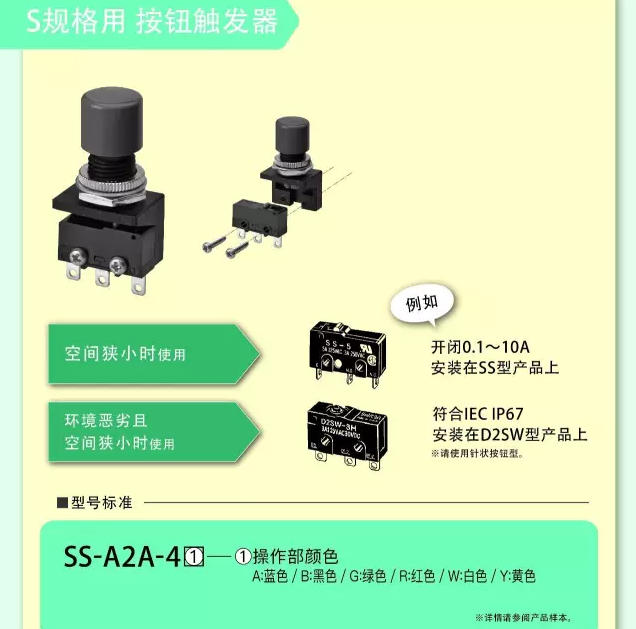 1、歐姆龍微動開關升級為單觸式操作開關,用于微動開關通用附件的V規格/S規格,新增按鈕觸發器系列