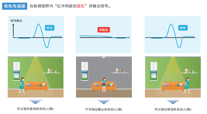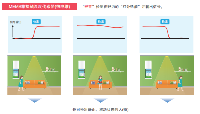 焦電傳感器和MEMS非接觸溫度傳感器都是接收紅外線微弱的熱能并輸出信號的傳感器。焦電傳感器無法檢測靜止狀態的人(物),而MEMS非接觸溫度傳感器可以檢測靜止狀態的人(物)。