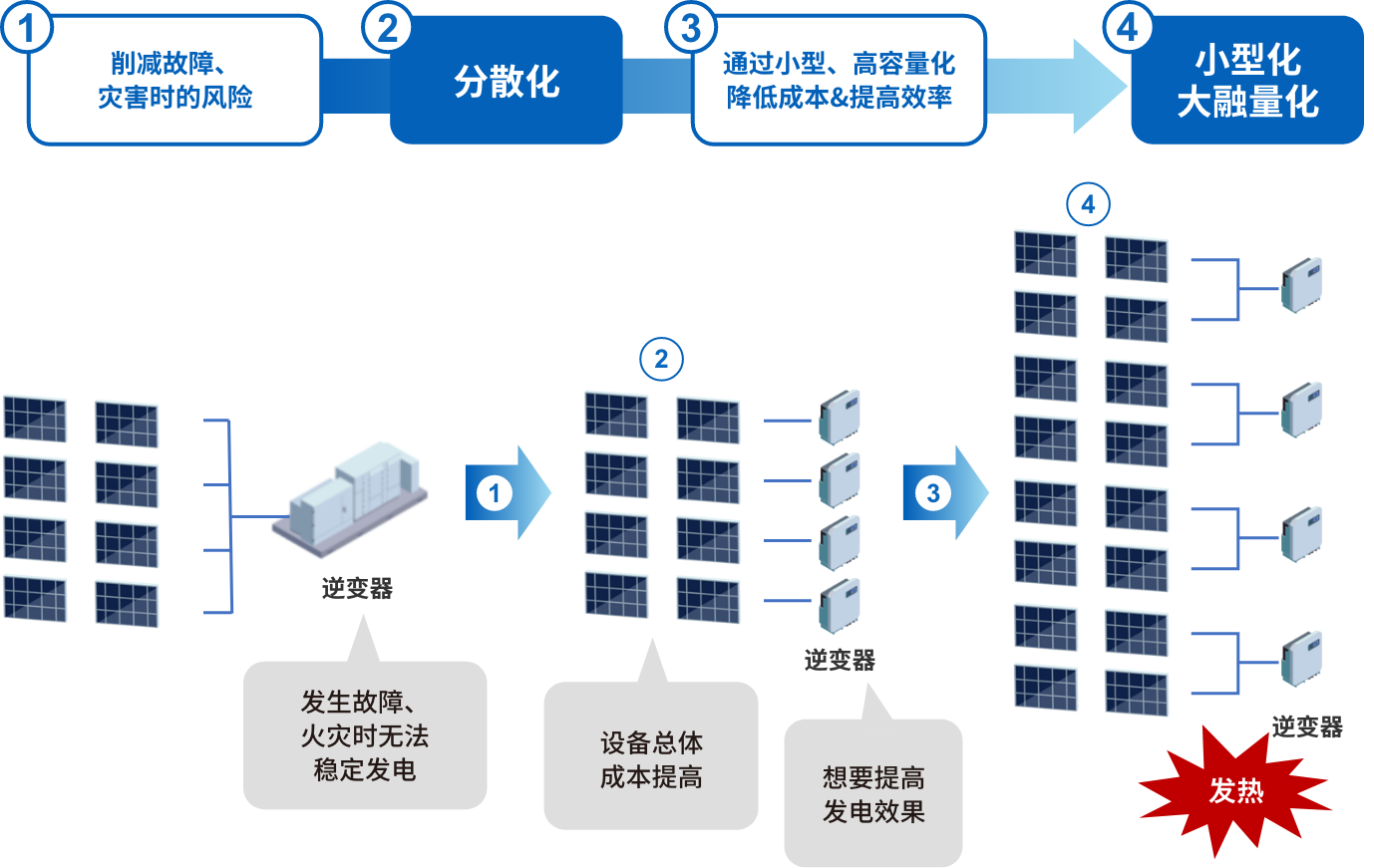 近年來,太陽能發(fā)電系統(tǒng)上的需求不斷發(fā)生變化。作為地震或水災(zāi)等災(zāi)害風(fēng)險(xiǎn)對(duì)策,更加穩(wěn)定的電力供給需求愈發(fā)高漲,并出現(xiàn)了從集中型系統(tǒng)向分散型系統(tǒng)轉(zhuǎn)化的趨勢(shì)。并非通過1臺(tái)光伏逆變器執(zhí)行電力轉(zhuǎn)換,而是分散至多臺(tái)光伏逆變器,由此降低了發(fā)生災(zāi)害時(shí)因設(shè)備故障等所致發(fā)電停止的風(fēng)險(xiǎn)。此外,各設(shè)備或機(jī)器上通過高容量、大電流化的配置提高了發(fā)電效率,并通過小型化、輕量化削減了設(shè)備投資,因而要求有效利用設(shè)備的呼聲愈發(fā)高漲。而另一方面,伴隨小型化、高容量化的發(fā)展,當(dāng)務(wù)之急是減少設(shè)備本身產(chǎn)生的熱量,這是造成能量損失和降低設(shè)備使用壽命的一個(gè)因素。