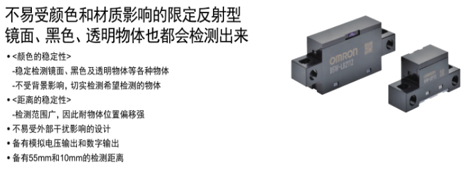 歐姆龍傳感器抗陽(yáng)光干擾強(qiáng),可穩(wěn)定檢測(cè)鏡面、黑色、透明物體,推出限定反射型傳感器B5W系列。接受來自檢測(cè)物體的反射光以檢測(cè)物體有無,擁有限定了投光光束和受光區(qū)域的光學(xué)系統(tǒng),僅可檢測(cè)相距傳感器一定距離(投光光束與受光區(qū)域重合的范圍)的檢測(cè)物體。