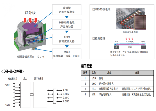 熱電堆紅外傳感器,就是利用貝塞克效應,內部由兩個或多個熱電偶串聯組成熱電堆芯片,通過吸收物體表面的紅外輻射,當目標溫度與參考溫度存在溫度差時,熱電偶產生的熱電動勢互相疊加并輸出對應溫度的電壓信號。這樣,使用熱電堆測量溫度時,一來可以克服單個熱電偶產生的電勢差太小而難以測量的缺點,二來可以避免使用價格較高的精度運算放大器。目前市面上熱電堆傳感器主要有模擬輸出型及數字輸出型這兩種類型,模擬輸出型雖然內部結構簡單且價格便宜, 但電路設計時需要考慮的問題較多,除了需要搭配低溫漂的運放+高精度ADC, 還要考慮低功耗、高SNR信噪比及電路穩定性等等,這些對研發人員來說是一項不小的挑戰。而歐姆龍D6T系列熱電堆紅外傳感器, 內置ASIC+高精度運放,通過內置MCU進行AD轉換及信號處理,可通過I2C數字接口獲取溫度數據。這樣不僅測溫電路穩定性有保障,也大大縮短了產品開發周期,一定程度上也節省了開發成本。