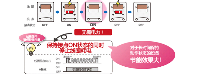 磁保持繼電器其觸點開、合狀態(tài)平時由永久磁鐵所產(chǎn)生的磁力所保持。當(dāng)繼電器的觸點需要開或合狀態(tài)時,只需要用正(反)直流脈沖電壓激勵線圈,繼電器在瞬間就完成了開與合的狀態(tài)轉(zhuǎn)換。通常觸點處于保持狀態(tài)時,線圈不需要繼續(xù)通電,僅靠永久磁鐵的磁力就能維持繼電器的狀態(tài)不變
