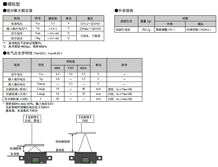 不易受顏色和材質影響的限定反射型鏡面、黑色、透明物體也都會檢測出來 < 顏色的穩定性 > 穩定檢測鏡面、黑色及透明物體等各種物體 不受背景影響,切實檢測希望檢測的物體 < 距離的穩定性 > 檢測范圍廣,因此耐物體位置偏移強 不易受外部干擾影響的設計 備有模擬電壓輸出和數字輸出 備有55mm和10mm的檢測距離