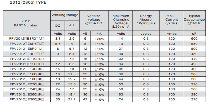 特征: 1、疊層片式陶瓷結(jié)構(gòu)。 2、無(wú)引線。 3、溫度范圍:-55℃~+125 ℃。 4、工作電壓范圍V w(dc)=3.3~ 615V。 5、具有雙向限制特性,適合ESD保護(hù)。 6、漏電流非常小。 7、寄生電感小、響應(yīng)速度快(響應(yīng)時(shí)間少于0.5ns)。 8、優(yōu)良的溫度系數(shù)。 9、良好的焊接性能(端電極為三層電鍍)。 應(yīng)用: 1、防止過(guò)電壓:當(dāng)施加的電壓升高到壓敏電壓時(shí),壓敏電阻器的電流急劇上升,被保護(hù)設(shè)備的浪涌電壓迅速減小,從而使裝有壓敏電阻器的設(shè)備抗浪涌噪聲能力達(dá)到相應(yīng)要求。